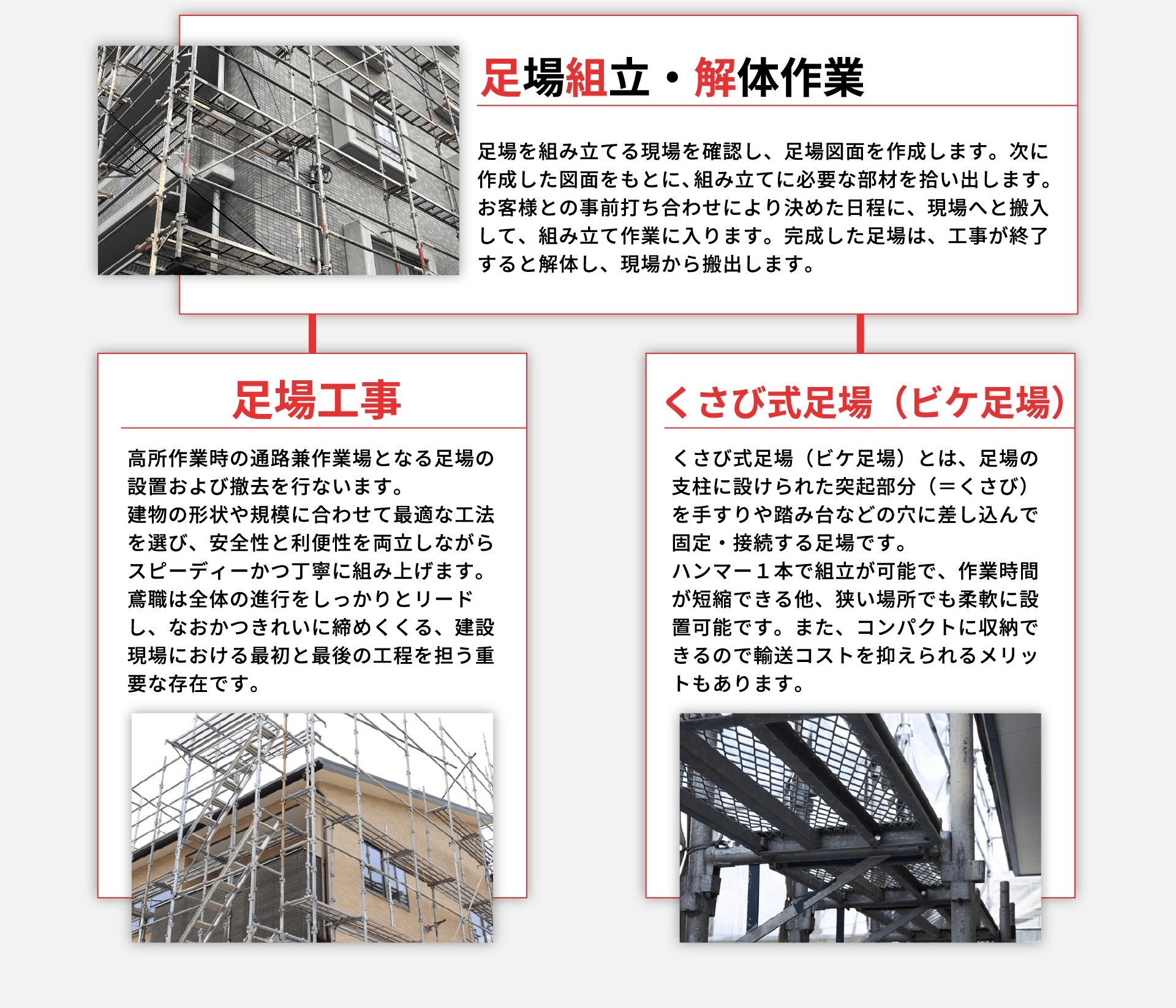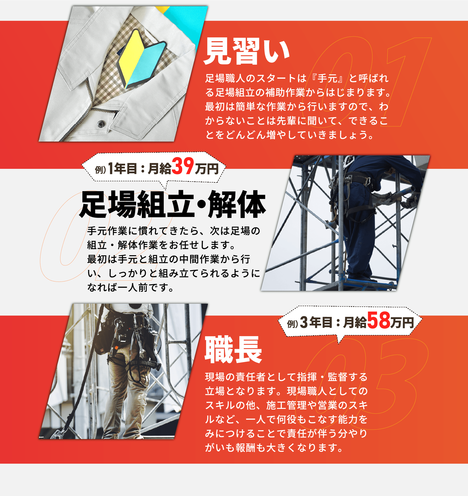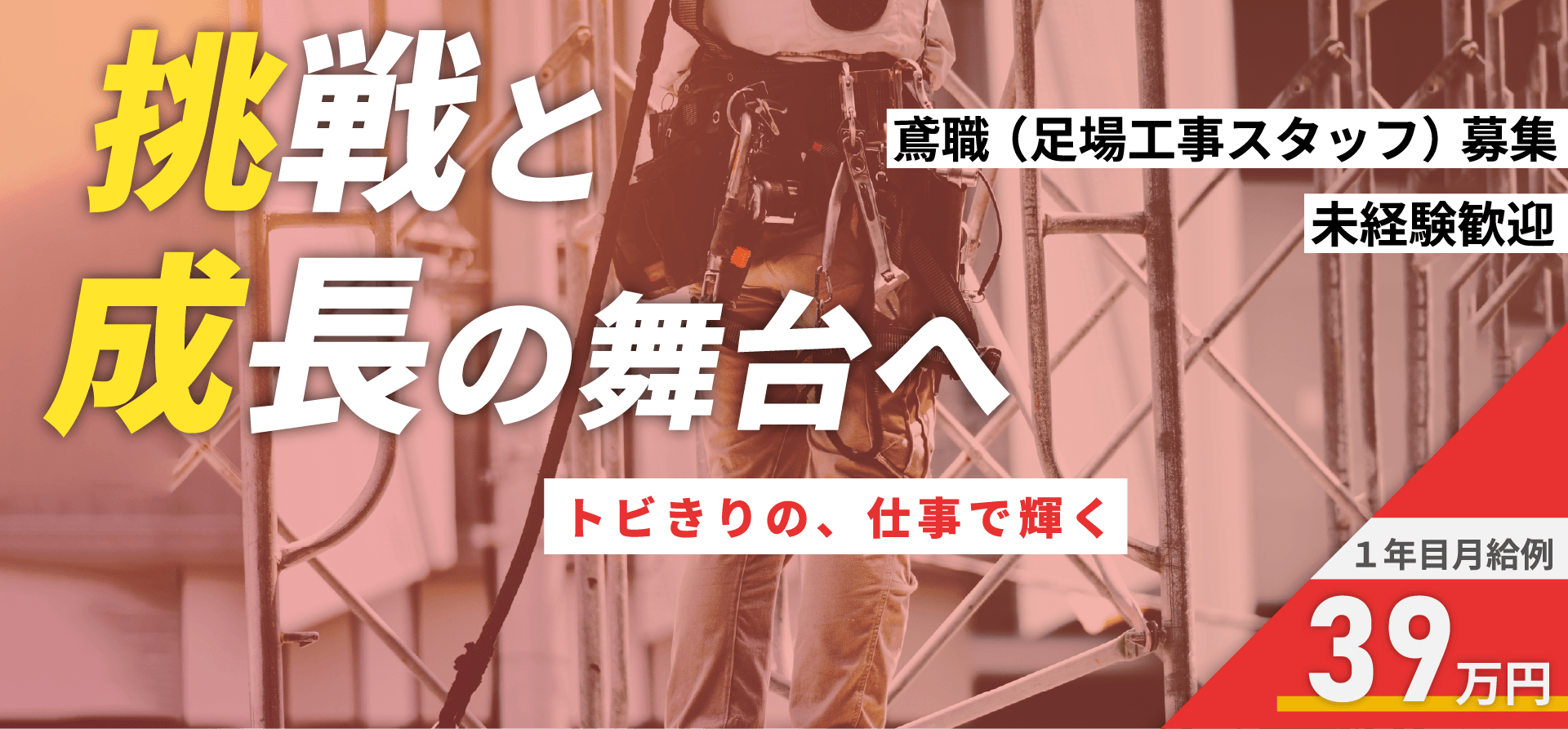 | 業務内容 | 建設現場でのくさび足場組立、解体作業などをしていただきます。 ◎まずは材料運びなど、簡単な作業からお任せします。 |
