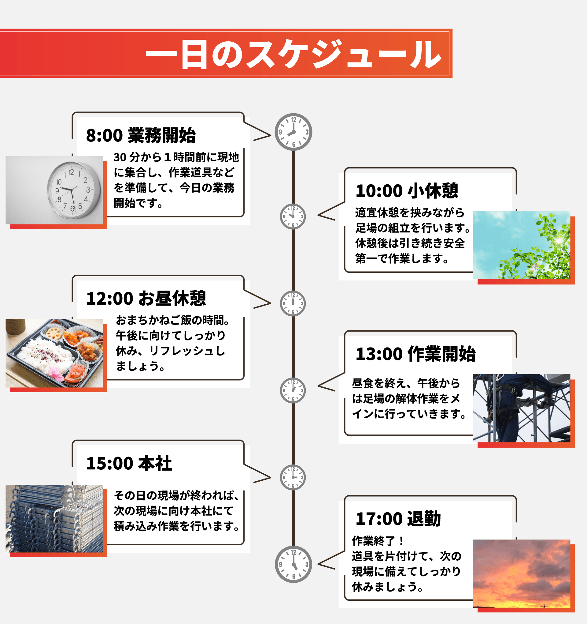 | 勤務時間 | 8:00~17:00(休憩1時間) ※現場によって異なる |