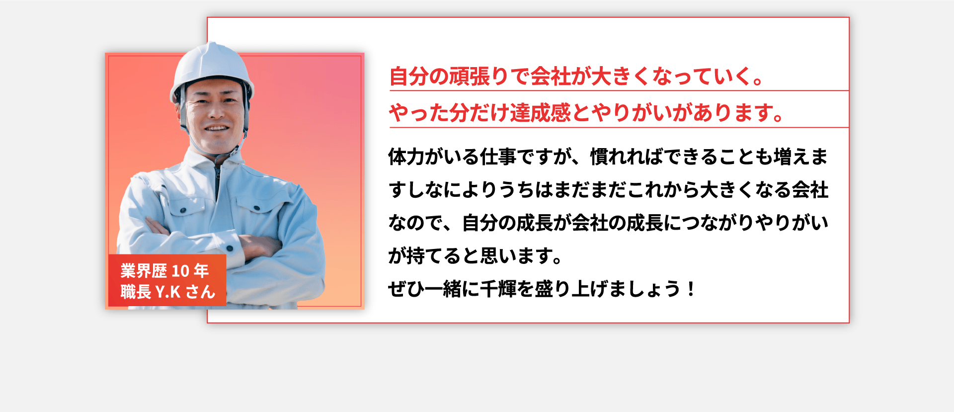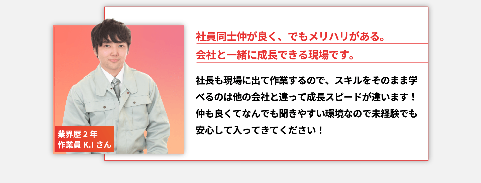 代表との距離が近いため風通しが良く、現場作業前に一緒にご飯を食べたり飲み会を行ったりなど、和気あいあいとした雰囲気ながら、しっかりとオンオフのついたメリハリのある社風です。