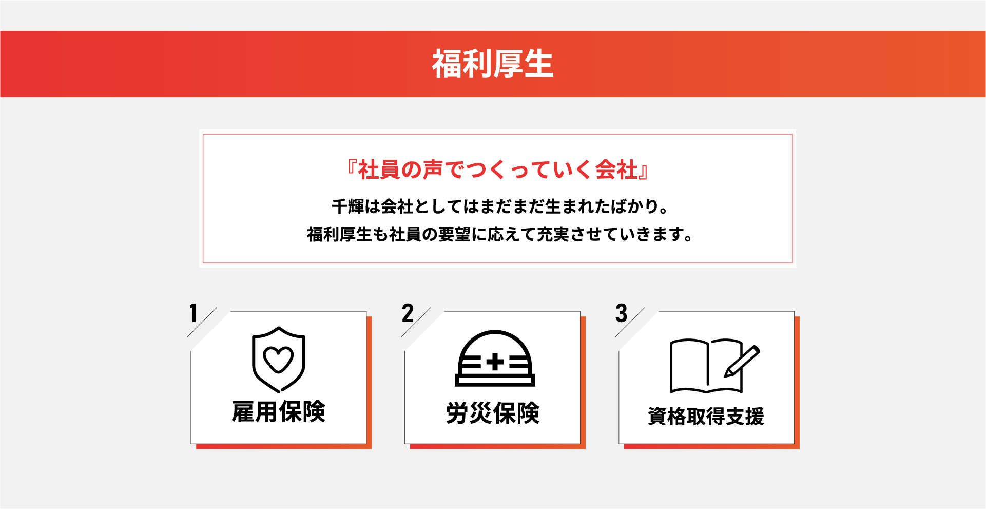 ・雇用保険 ・労働災害保険 ・厚生年金 ・資格取得支援制度 |