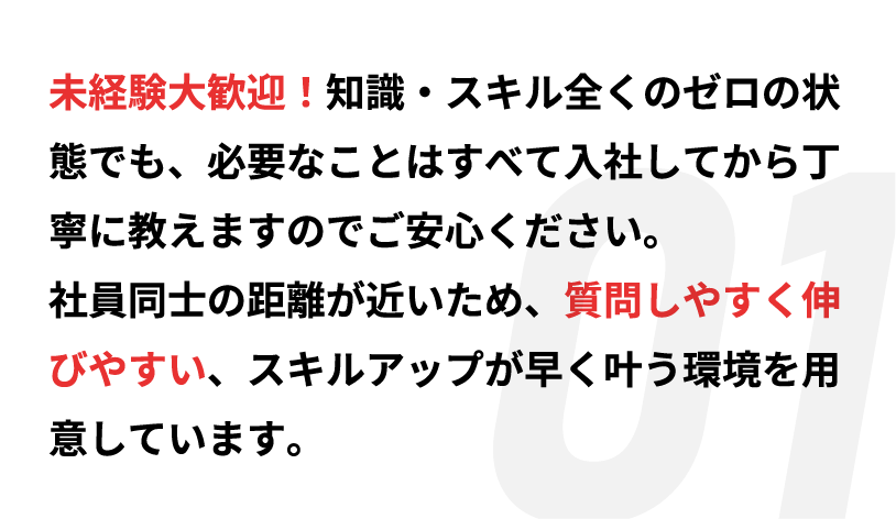 入社後は実際に現場で作業を行いますが、未経験で入社された方には、先輩社員がついて丁寧に指導します。